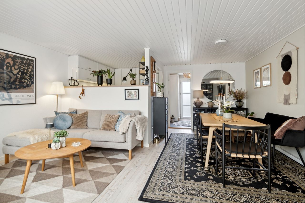 hvor der er en halv væg til køkkenet. Der er gode møblerings muligheder for opholdsstue samt til spise