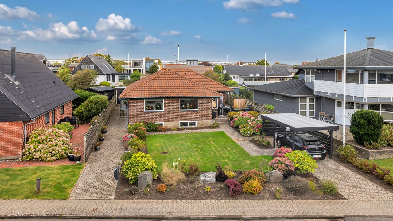 Villaen er opført i en flot brun sten, med tegltag og har tilhørende carport samt et godt redskabsrum og er beliggende med flot hav udsigt og i gåafstand til stranden.