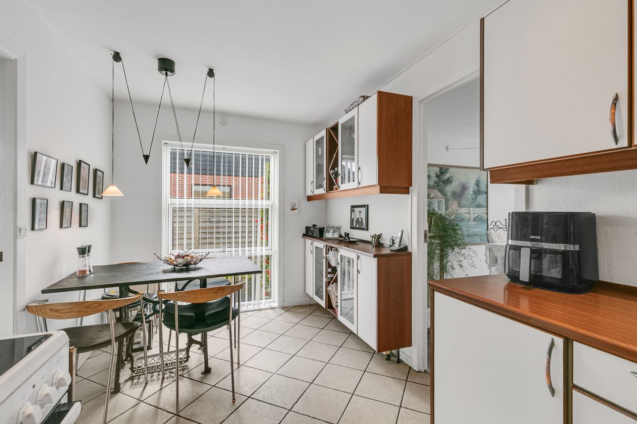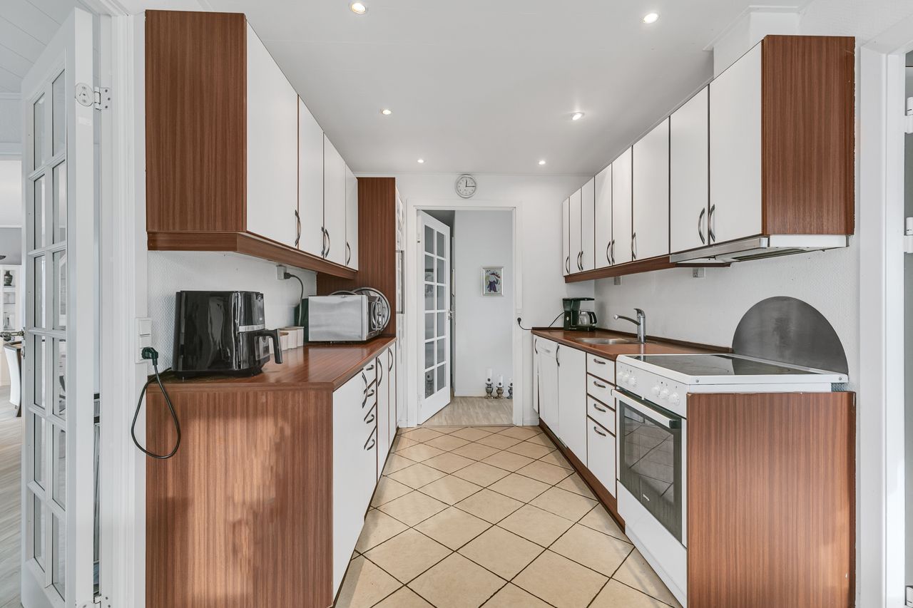 Pænt lyst køkken, med hvide låger med trækant, diagonalt liggende klinkegulv, med gulvvarme, sep. spiseplads og indbygningsspots i loftet og der er monteret flot fransk hvid sprossedør til spisestuen.