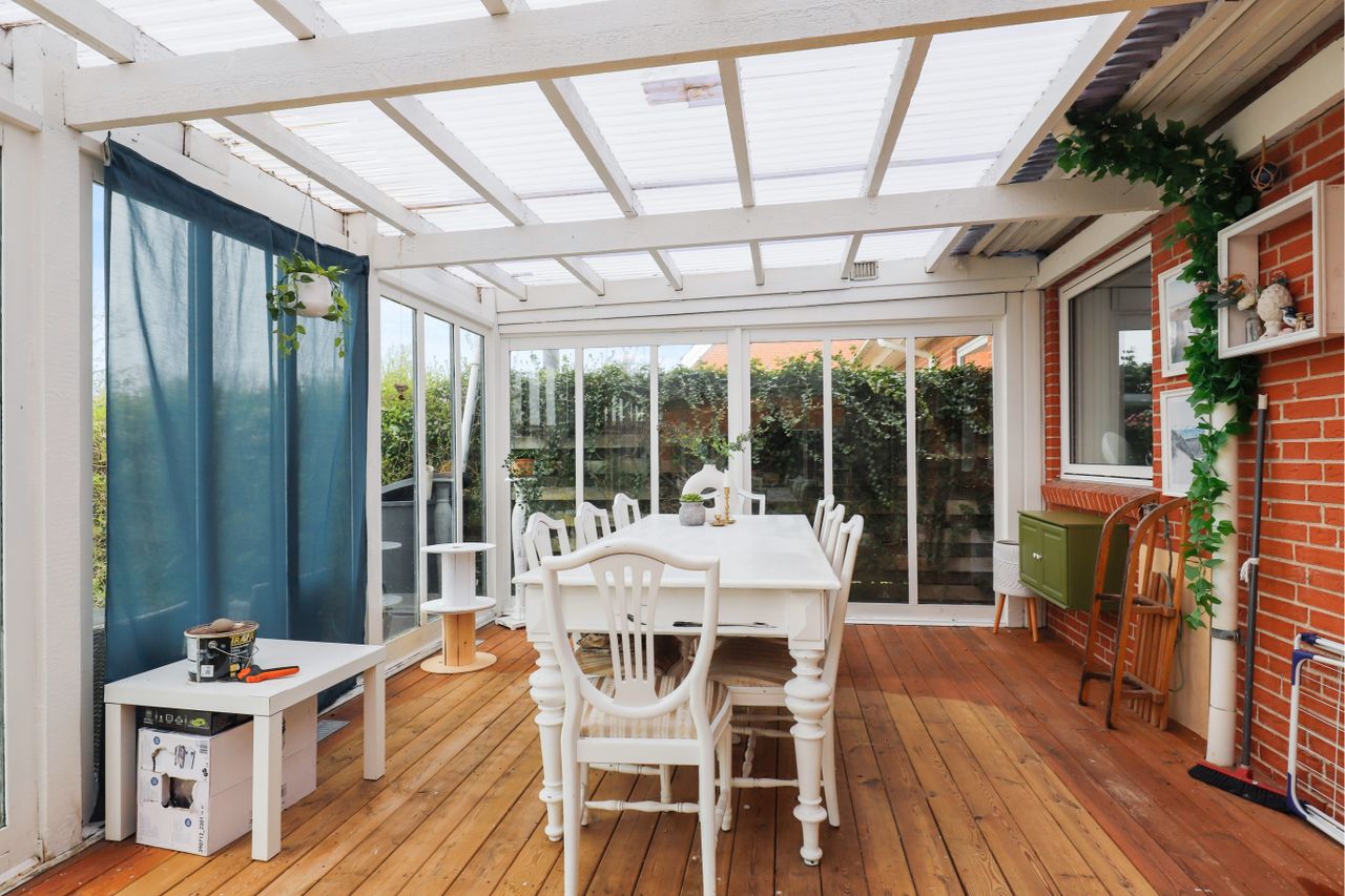 Flot lyst nyere køkken, med hvide elementer og smuk mørk bordplade, der er endvidere pålagt et pænt klinkegulv, køkkenet er i åben forbindelse til den skønne store stue, som er opdelt i spisestue, med plads til stort spisebord og en hyggelig opholdsstue, der er pålagt et flot lyst laminatgulv. Der er fra stuen, udgang til den store udestue og derfra er der udgang til, stor solrig flisebelagt ugenert have.