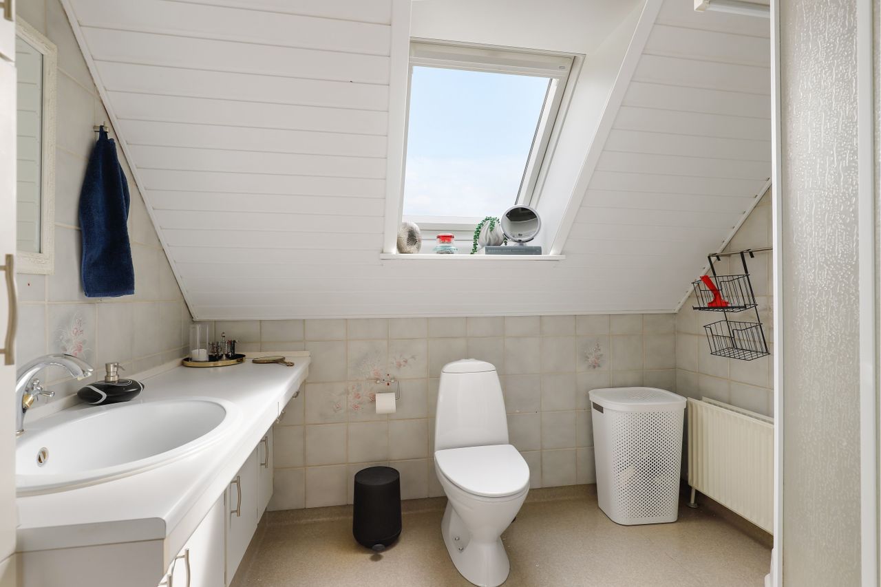 Pænt stort lyst badeværelse, med vinylgulv, med ensfarvede klinker på væggene, sep. bruseniche, samt pæn hvid badeværelses miljø skab, med nedfældet håndvask, skråvæg, med ovenlysvindue.