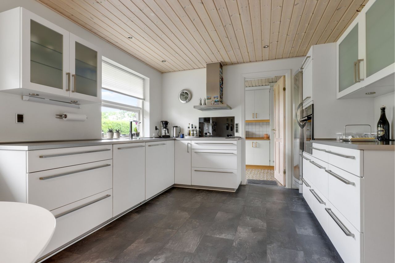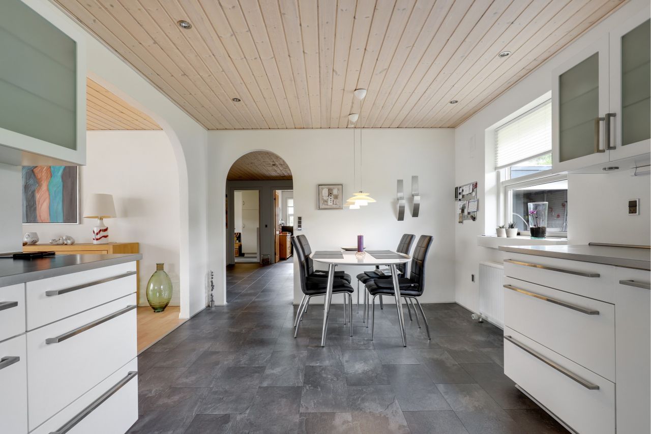 med nydeligt klikgulv. Køkkenet er i åben forbindelse til den skønne store møblerings venlige lyse